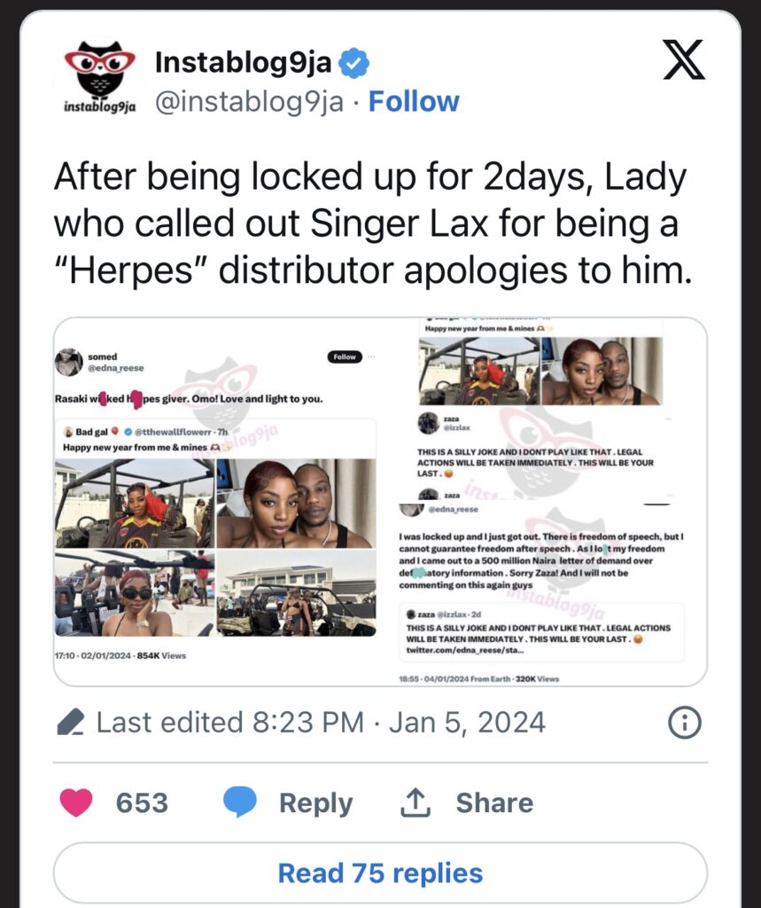 The user, one @edna.reese made defamatory statements about LAX on the social media platform on January 2, 2024. She quoted a picture of LAX with his alleged girlfriend with the comment “Rasaki wicked herpes giver. Omo! Love and light to you. Immediately, LAX countered her claims, but on on January 4, 2024, the user wrote, “I was locked up and just got out… I was locked up and I came out to a 500 million naira letter of demand…”