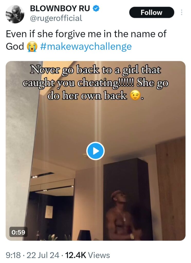 He wrote: “Never go back to a girl that caught you cheating!!! She go do her own back.”