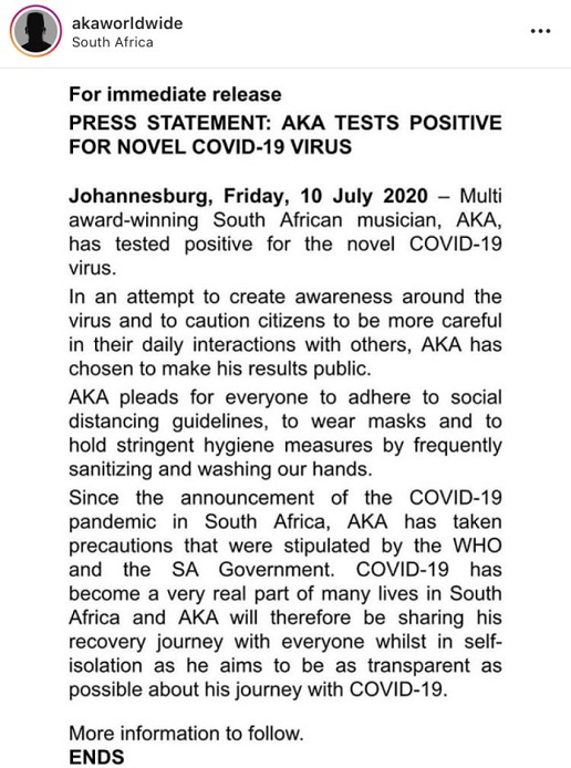 AKA comes as the latest South African celebrity to have contracted the virus since it broke out in the country.
