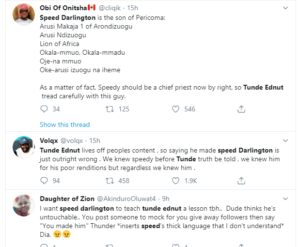 Nigerians who reacted to the social media fight, stated that they knew Speed Darlington before knowing Tunde Ednut’s Instagram handle. They also warned him to tread carefully as Speed Darlington is the son of famous late Imo herbalist, Pericoma.
