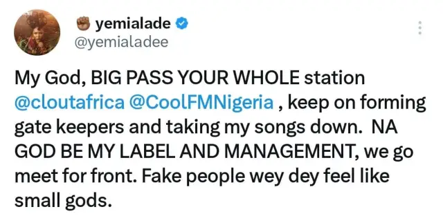 @cloutafrica @CoolFMNigeria, keep on forming gate keepers and taking my songs down. NA GOD BE MY LABEL AND MANAGEMENT, we go meet for front. Fake people wey dey feel like small gods.
