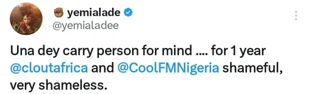 ”My God will fight for me, and I will hold my peace. Since December 2023 … I personally reached out in January….. still, you are refusing to play my music and give my team a hard time. YOU’RE NOT GATE KEEPERS, and YOU ARE NOT GOD Mr Serge Noujaim and Mr Joseph Adamu …. MY GOD WILL FUSTRATE YOU ALL. @coolfmlagos @cloutafrica”