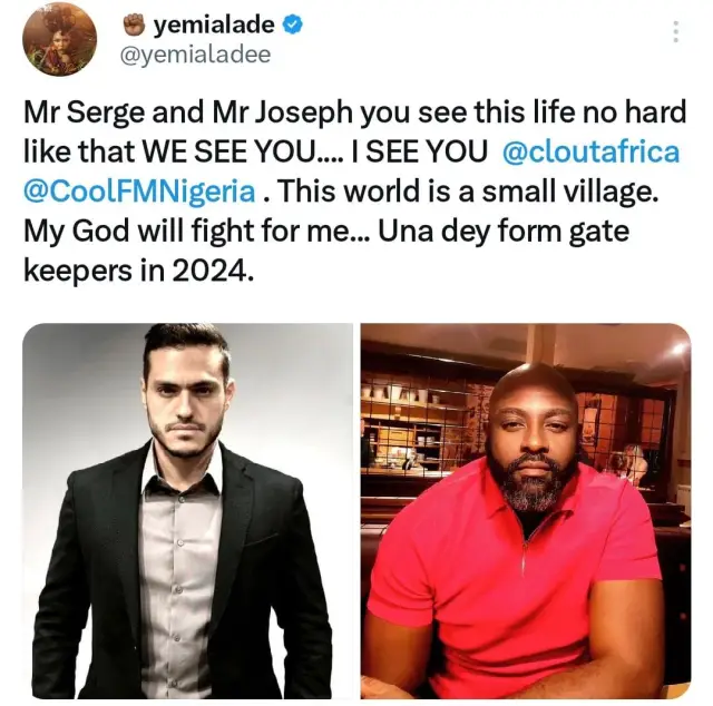 ”Mr Serge and Mr Joseph you see this life no hard like that WE SEE YOU…. I SEE YOU @cloutafrica @CoolFMNigeria. This world is a small village. My God will fight for me… Una dey form gate keepers in 2024.