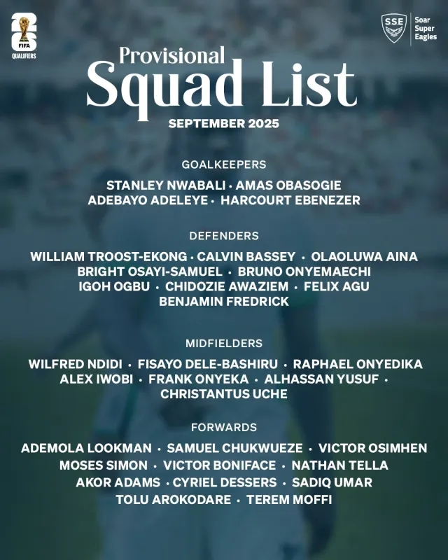 Super Eagles head coach Eric Chelle has announced a 31-man provisional squad for Nigeria’s pivotal 2026 FIFA World Cup qualifiers against Rwanda and South Africa in September