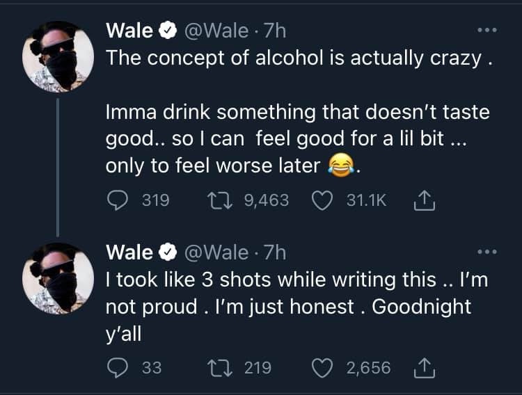 According to him, he is supposed to drink something that will make him feel good even though it doesn’t taste good. Wale added that the drink makes him feel good for a little while, but makes him feel worse later.