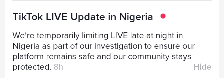 “We’re temporarily limiting LIVE late at night in Nigeria as part of our investigation to ensure our platform remains safe and o“We’re temporarily limiting LIVE late at night in Nigeria as part of our investigation to ensure our platform remains safe and our community stays protected,” the notification stated.ur community stays protected,” the notification stated.