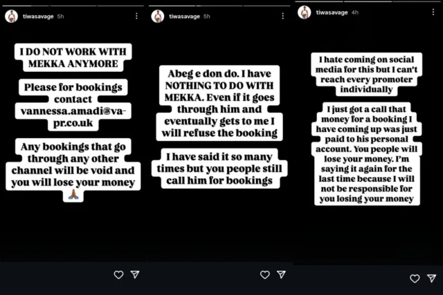 In a series of posts on her Instagram story, the singer announced to the world that she no longer works with Mekka and that bookings through him are at people’s risk.