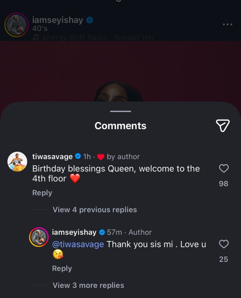 Commenting on Seyi Shay’s birthday post, Tiwa wrote: “Birthday blessings Queen, welcome to the 4th floor.”