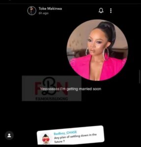 She made this known during a Q&A session on Snapchat when a fan inquired about Toke’s marital status, to which she responded by saying that she will be tying the knot soon.