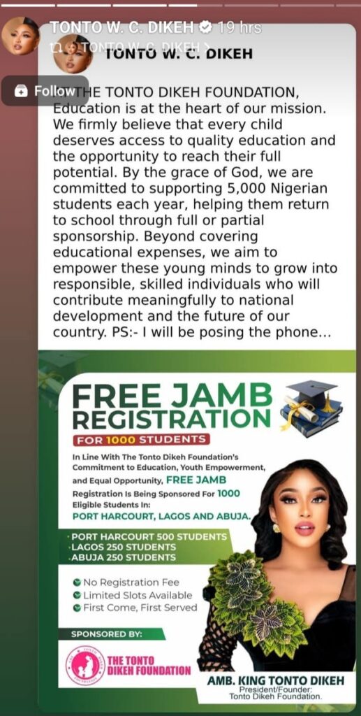 The actress announced on Instagram that she will sponsor free JAMB registrations for 1,000 students through the Tonto Dikeh Foundation.