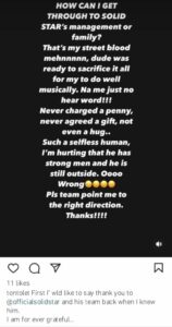 “First I’ wld like to say thank you to @officialsolidstar and his team back when I knew him. I am for ever grateful.