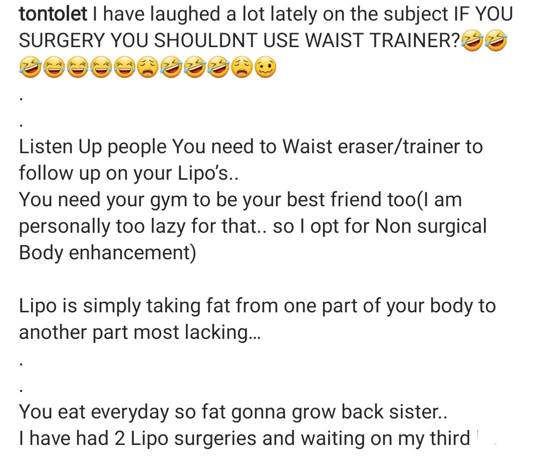 The actress, who has been open about her body enhancement and even documented her first procedure on an LITV show, revealed she has had two liposuction surgeries so far.
