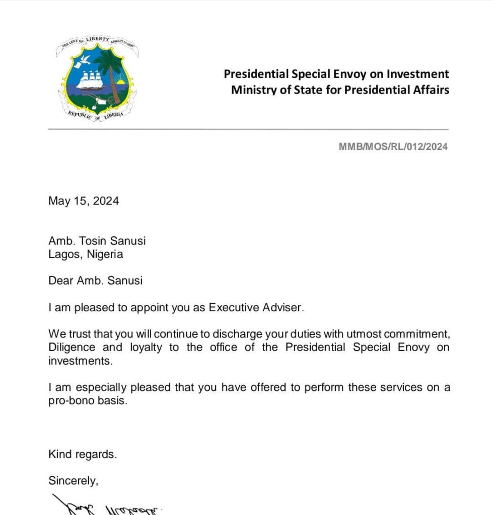 Ambassador Tosin Sanusi Appointed as Executive Adviser, Presidential Special Envoy on Investment Republic of Liberia Amb.