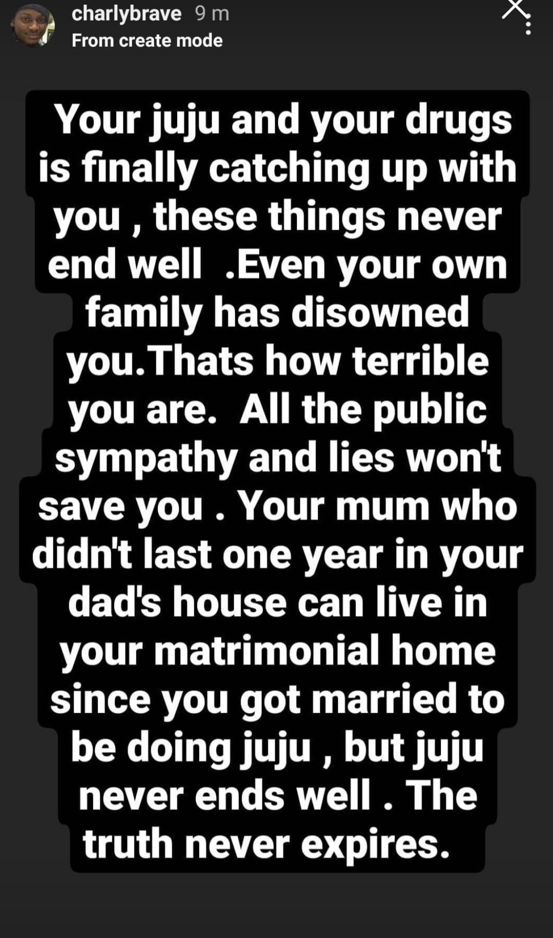 He proceeded to call Annie’s mother out for not being able to live with her husband in her matrimonial home. He then doubled down on the accusation that Annie’s mother is into “juju” and she’s practicing it in Tuface’s house.