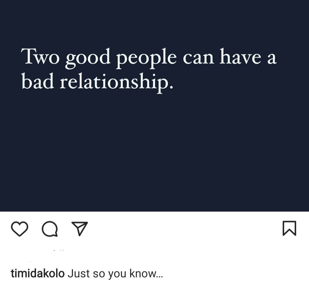 He wrote on Instagram: “Two good people can have a bad relationship.”