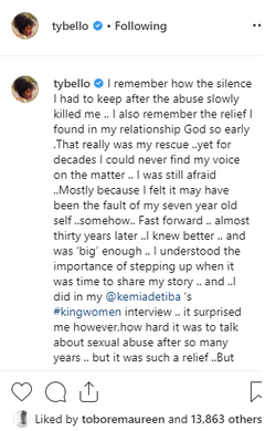 ”I remember how the silence I had to keep after the abuse slowly killed me .. I also remember the relief I found in my relationship God so early .That really was my rescue ..yet for decades I could never find my voice on the matter .. I was still afraid ..Mostly because I felt it may have been the fault of my seven year old self ..somehow.. Fast forward .. almost thirty years later ..I knew better .. and was ‘big’ enough .. I understood the importance of stepping up when it was time to share my story .. and ..I did in my @kemiadetiba ‘s #kingwomen interview .. it surprised me however,how hard it was to talk about sexual abuse after so many years .. but it was such a relief ..But soon after came the resistance …