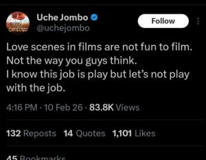 Taking to Twitter, the Nollywood actress made it clear that filming intimate scenes is far from what many assume.