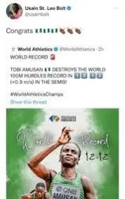 Quoting a tweet confirming Tobi’s win at the semis by the World Athletics official page, Bolt lauded the champion.
