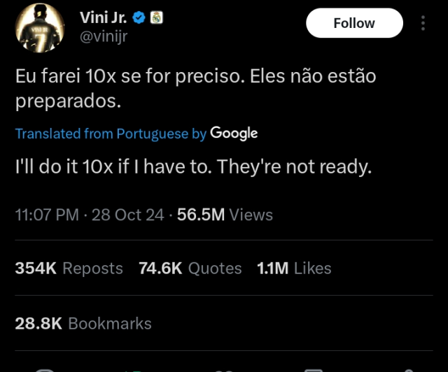 Vinicius Jr. breaks silence after Balon d’or snub”I’ll do it 10x if I have to. They’re not ready,” Vinicius Jr. tweeted, to break his silence.