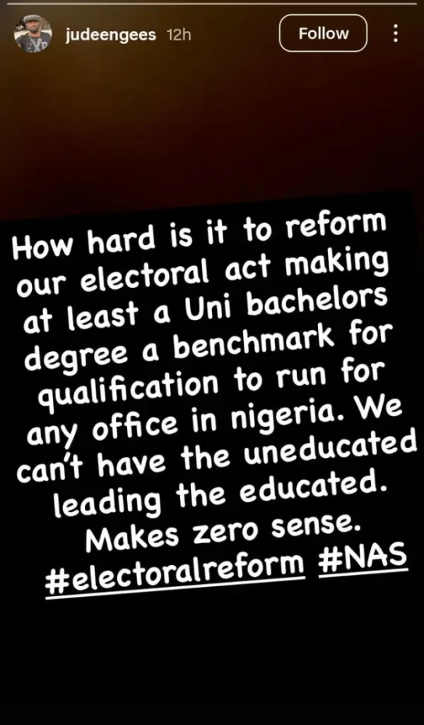 He wrote: “How hard is it to reform our electoral act making at least a Uni bachelors degree a benchmark for qualification to run for any offce in nigeria.