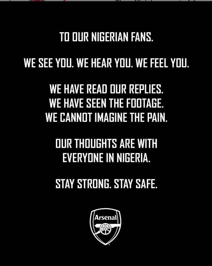 The club’s message reads, “To our Nigerian fans, we see you, we feel you. We have read our replies, we have seen the footage. We cannot imagine the pain. Our thoughts are with everyone in Nigeria. Stay strong, stay safe.”