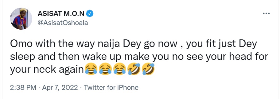 Omo with the way naija Dey go now , you fit just Dey sleep and then wake up make you no see your head for your neck again