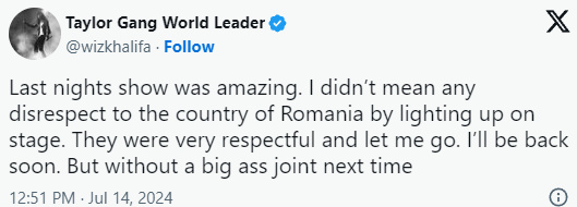 Following his release, Wiz Khalifa shared a post on X (formerly Twitter) about his arrest.