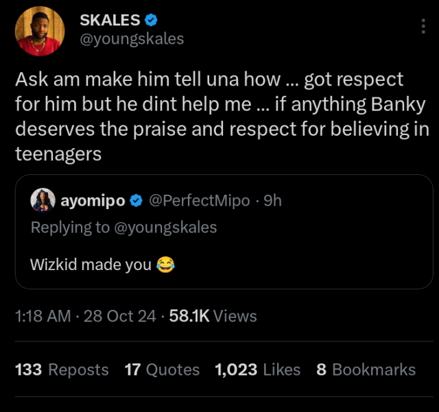 n X user, @Perfect_Mipo however insisted Wiz made him, which made Skales fire back.