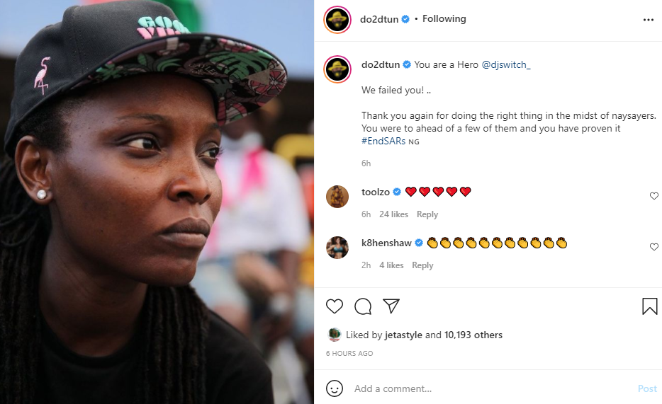 OAP Dotun has taken to his Instagram page to celebrate DJ Switch after the Lagos panel of Inquiry on the October 20, 2020, Lekki tollgate shooting incident, indicted the Army and Police and also described the incident as a “massacre” The panel on Monday, November 15, turned in its report after one year of investigation and in the report, security agents were indicted for shooting at the protesters. The Federal government had repeatedly denied there was a ”massacre,” and DJ Switch was vilified by some people. Recall that DJ Switch did a live IG session from the scene of the incident on that day. Reacting to the new development via his IG page, Dotun hailed DJ Switch and called her a hero