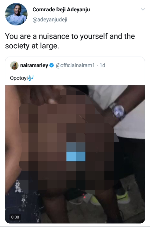 Activist Deji Adeyanju has called out Naira Marley on twitter telling him out-rightly that he is a NUISANCE to himself and the society. Naira Marley had shared a video on twitter showing a man dancing right behind a woman with a big butty and his song ”opotoyi” playing in the background.