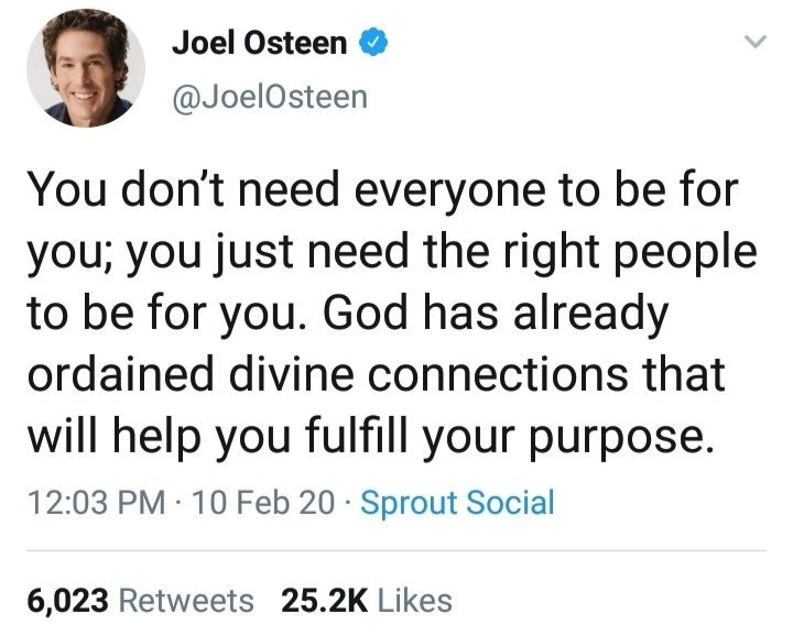 “You don’t need everyone to be for you; you just need the right people to be for you. God has already ordained divine connections that will help you fulfill your purpose.”