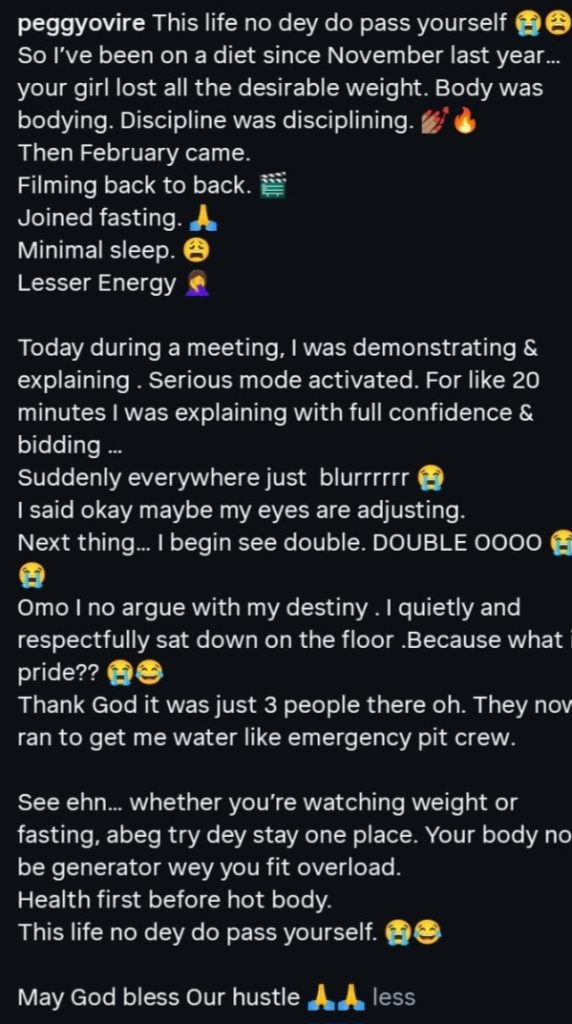 Peggy’s advice for anyone watching their weight or fasting is simple: “See ehn… whether you’re watching weight or fasting, abeg try dey stay one place. Your body no be generator wey you fit overload. Health first before hot body. This life no dey do pass yourself. May God bless our hustle.”