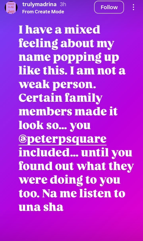Certain family members made it look so… you @peterpsquare included… until you found out what they were doing to you too. Na me listen to una sha”