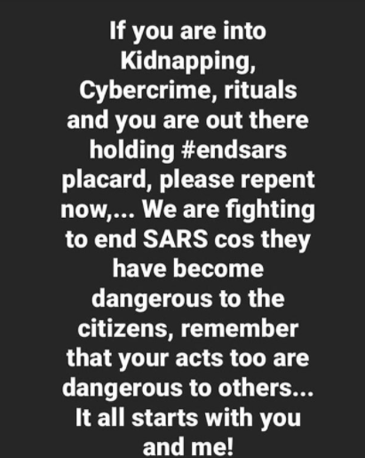 Nollywood actress,Yvonne Jegede has reminded Yahoo boys and girls in the country that #EndSARS is not for them. She made the reminder on her Instagram page, while saying the protests is for innocent citizens that are been killed unjustly and harassed.