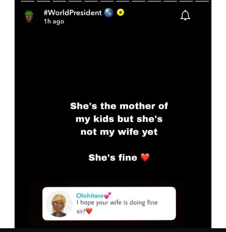 The singer made the clarification known on his Snapchat page while responding to a fan who inquired about his wife.